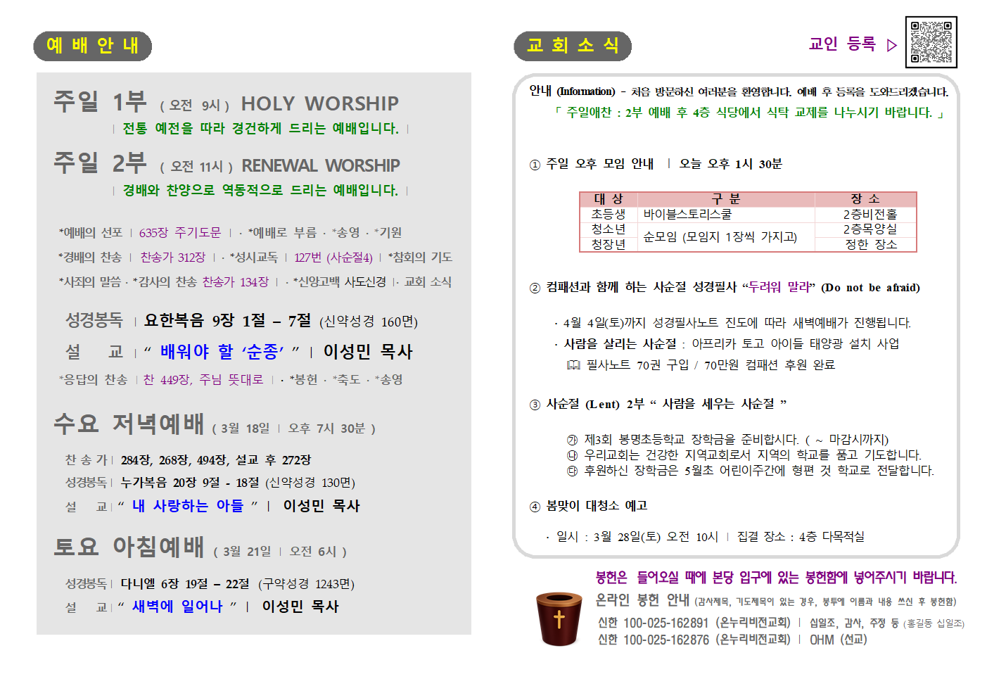 예배시간 및 장소 안내