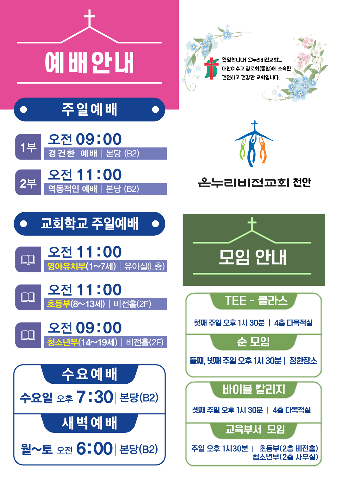 | 수요 저녁예배 토요 아침예배 | 수요일 토요일 | 오후 7:30 오전 6:00 | 본당(B2) |